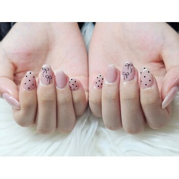 ほんのり透け感のあるナチュラルピンクに、手描きリボンとドットを合わせた可愛いデザイン。