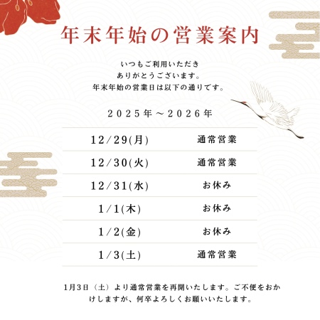 12/31(水)2026/1/1(木) ~1/2(金) 休業